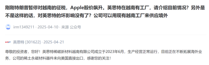 英思特[301622]:英思特稀磁新材料越南有限公司成立于2023年6月,生产经营正常运行,目前正在不断拓展海外业务,公司的稀土永磁材料器件未向美国直接出口。