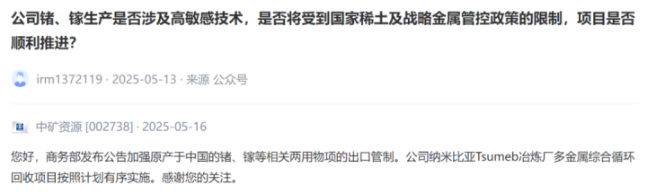 中矿资源[002738]:商务部发布公告加强原产于中国的锗、镓等相关两用物项的出口管制。公司纳米比亚Tsumeb冶炼厂多金属综合循环回收项目按照计划有序实施。