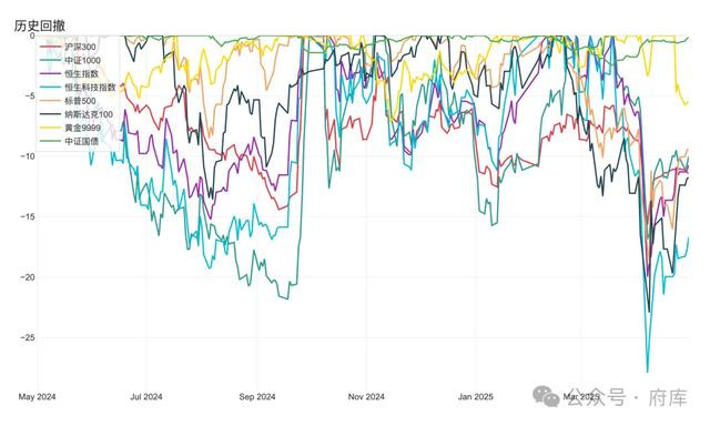而近一年时间各类资产的最大回撤不小,A股、港股、美股这三个主要权益市场都有着20%左右最大回撤,恒生科技、纳斯达克100最大回撤分别达到27.91%和22.93%,中证1000有21.82%,恒生指数与标普500接近20%。