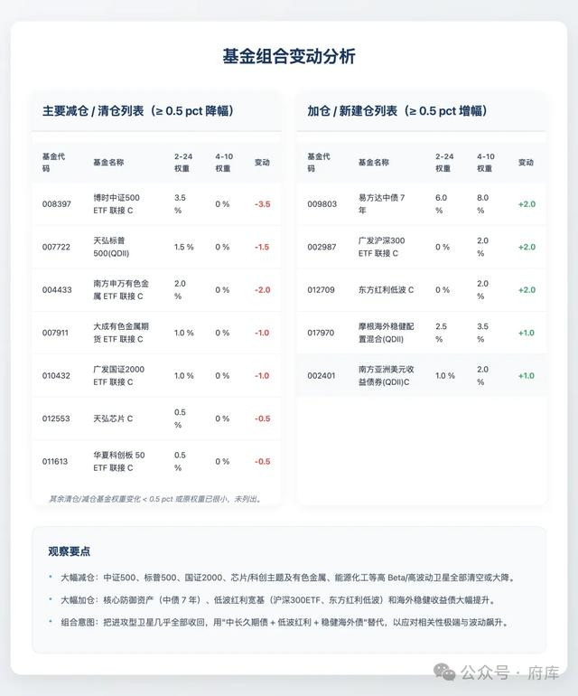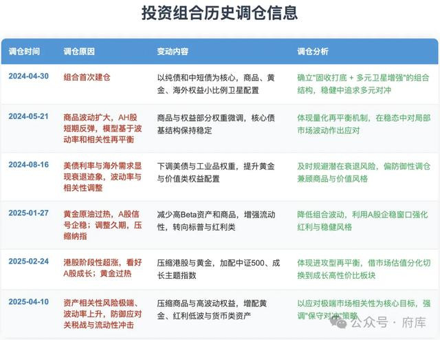 从历史调仓中能看到这个子策略优化是非常积极的。比如在4月10日这次调仓中,会大幅减掉偏成长和高波动的权益类资产,转而调整为更加稳健的权重类指数与红利类资产,美元资产也将标普500调换为美债基金。
